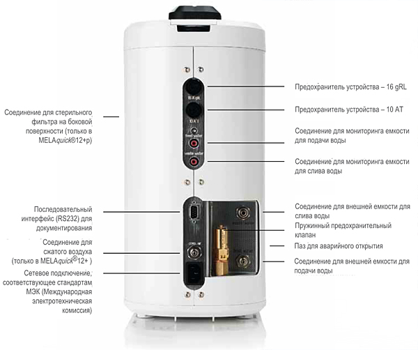 MELAquick®12+ требует гораздо меньше пространства для установки - 20,5 х 45 см (ширина х глубина) - по сравнению с другими автоклавами. Имеются две 5-литровые емкости для подачи деминерализованной воды и для уже использованной и повторно конденсированной воды. Эти емкости можно разместить под рабочей поверхностью.